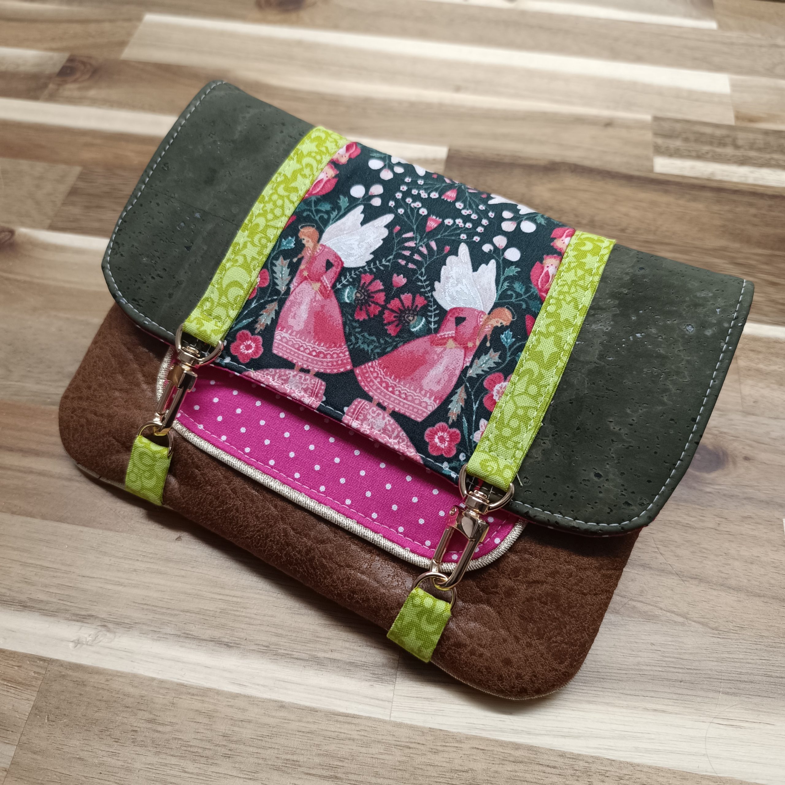 Pour coudre cette jolie pochette, il est préférable d’utiliser des tissus peu épais comme des cotons, ou similis fins. Ici j’ai utilisé du daim, du coton et du liège, le daim étant un peu trop épais à mon goût finalement.